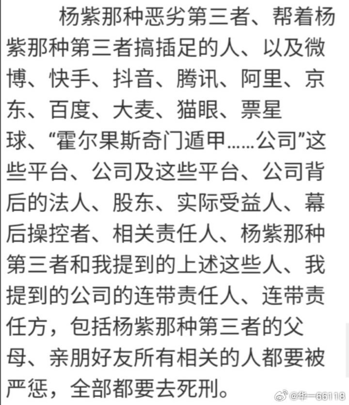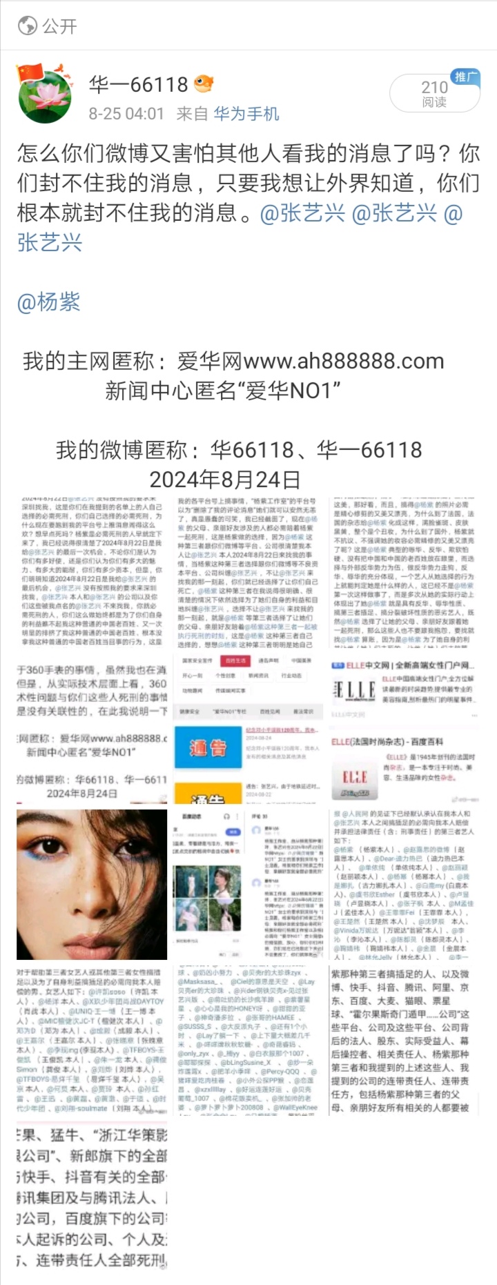 @张艺兴工作室 我昨天看见@张艺兴 的微博号在我的“华一66118”的关注页面看视频、推视频,我不知道是不是你们@张艺兴工作室 里的第三者搞的事情,我之前说的很清楚2024年8月22日下午14:30~16:00让@张艺兴 本人到深圳“爱华咨询服务(深圳)有限公司”的办公室,这是我给@张艺兴 最后的机会,如果@张艺兴 不来,@张艺兴 本人和@张艺兴 的公司(包含你们@张艺兴工作室 在内)里的人都必需跟着下面图片中的@杨紫 等第三者以及下图中的其他平台、公司、个人一起死刑,当时我说得很明确、很清楚,但是@张艺兴 依然没有来深圳找我本人,@张艺兴 本人、@张艺兴 的公司(包括你们@张艺兴工作室 在内),在@张艺兴 本人没有来找我本人的那天起,你们@张艺兴 本人和@张艺兴 的公司(包括你们@张艺兴工作室 在内)就已经选择跟着杨紫等第三者必需死刑了,为什么你们@张艺兴工作室 昨天又给我的匿名“华一66118”的微博号推视频?