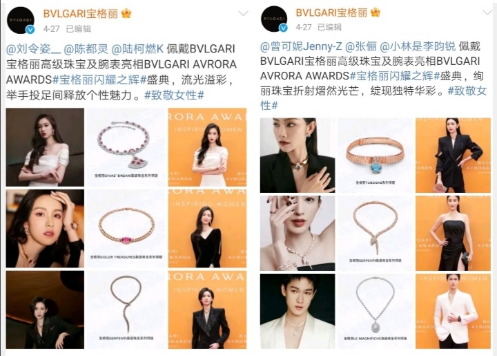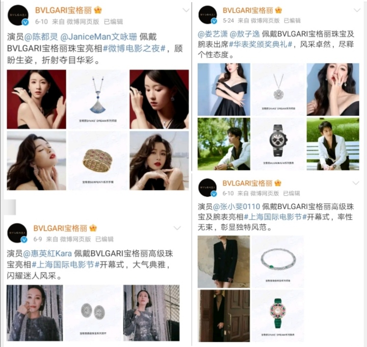 下列为佩戴宝格丽品牌为宝格丽做宣传的艺人