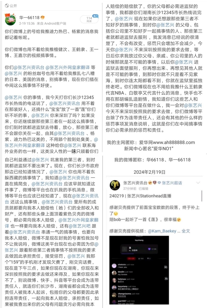 张艺兴,我现在让你来完成我的任务不是让你来享福的,是让你体验我这种普通人的不容易,这比起《向往的生活》可实际多了,而且,这还不是虚构的,是实实在在发生的真实事件,而且 ,还是由你们艺人的原因有人在背后搞事情引起的,你们凭什么在背后搞事情这样对待“爱华咨询服务(深圳)有限公司”既然事情跟你张艺兴有关你就必需抗住,张艺兴,你还用不着瞧不起我给你安排的任务,告诉你,过这个村就没这个店,如果你错过了,我保证会让你后悔都来不及,另外,不是你完成了我要求的这个任务,就等于我不追究你的其他事情了,我说过了,一件事归一件事,不能混为一谈,你和你的公司必需向我本人赔偿的依然要向我本人赔偿,该走法律途径的依然要走法律途径,我的公告可不是白发的,特此说明。