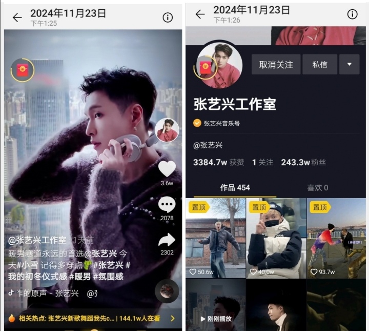 近期张艺兴本人的抖音号和张艺兴工作室的抖音号给我推视频,我对张艺兴本人和对张艺兴工作室的通告